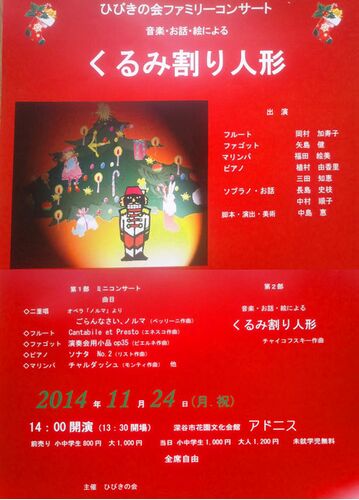 予告したままになっていた、 コンサートのお知らせ続報です。 -+-+-+-+-+-+-+-+-+-+-+-+-+-+-+-+-+-+-+-+ ひびきの会 ファミリーコンサート 「くるみ割り人形」 -+-+-+-+-+-+-+-+-+-+-+-+-+-+-+-+-+-+-+-+ 11月24日(月・祝) 開演14:00(開場13:30) 会場…
