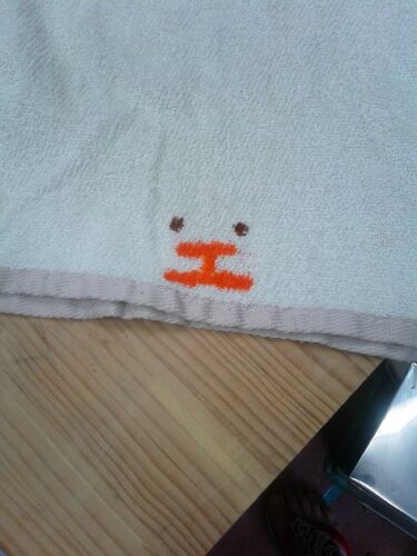 洗濯物が乾かない。タオルが臭くなる季節だ。 臭いタオルは降格になる。食器>台所手拭き>工房か雑巾 工房用のタオルは、他と区別するために印をつける。 オレンジのマジックで「工」とかいた。 なんか愛らしかったので目もかいてみた。 カワイイ。 いむげ…